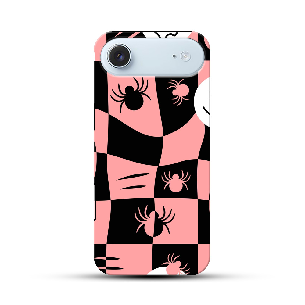 ピンクと黒のチェッカーボード柄のかわいいおばけとクモ